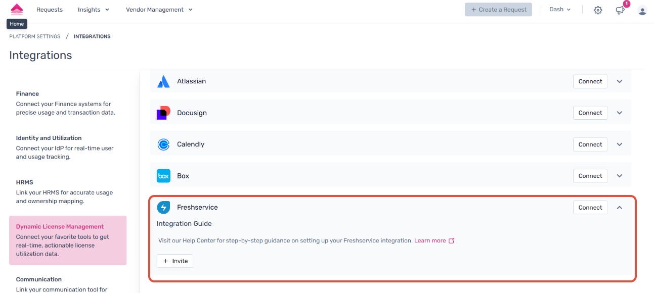 Step 2. Navigate to Freshservice under Dynamic License Management and click Connect; ensure you are logged in to your Freshservice account. If an admin is required to connect, open the accordion and click Invite to invite an admin to complete the connection.