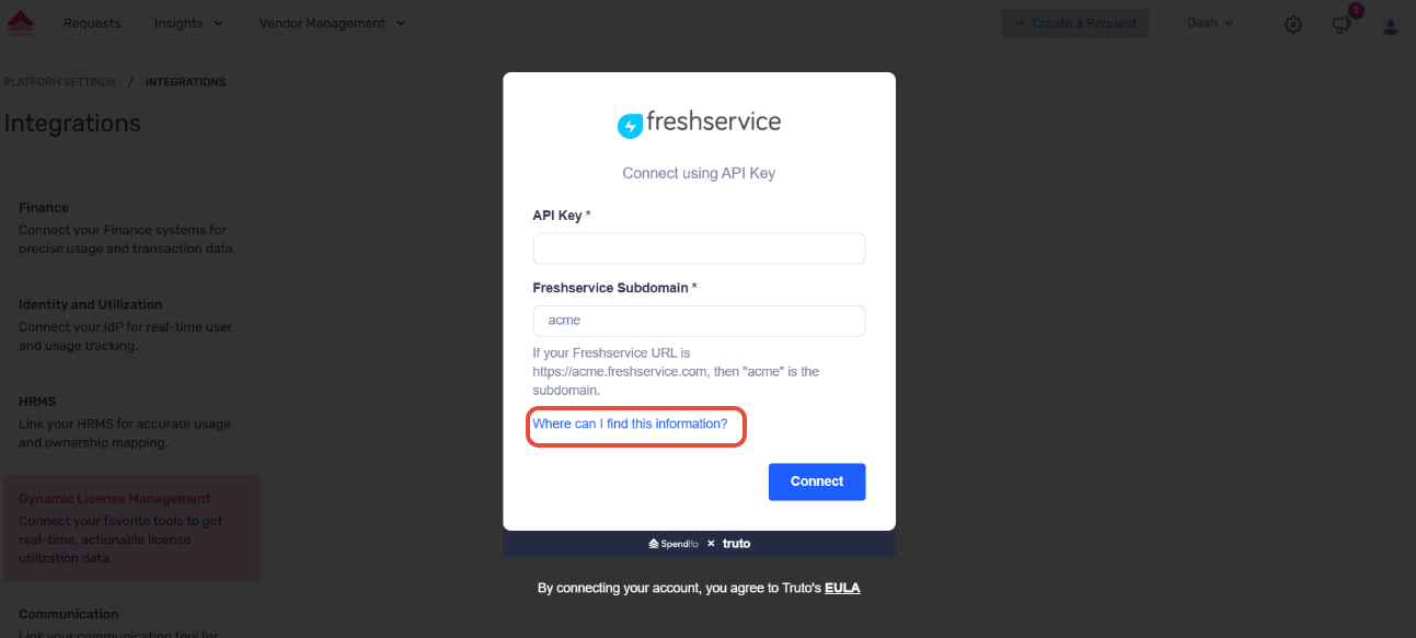 Step 4. You'll now be prompted to add the subdomain and API Key. View the page linked here for more details on how to get the API key and subdomain details for Freshservice. You can also click on the "Where can I find this information?" option on the API key connect pop-up window.