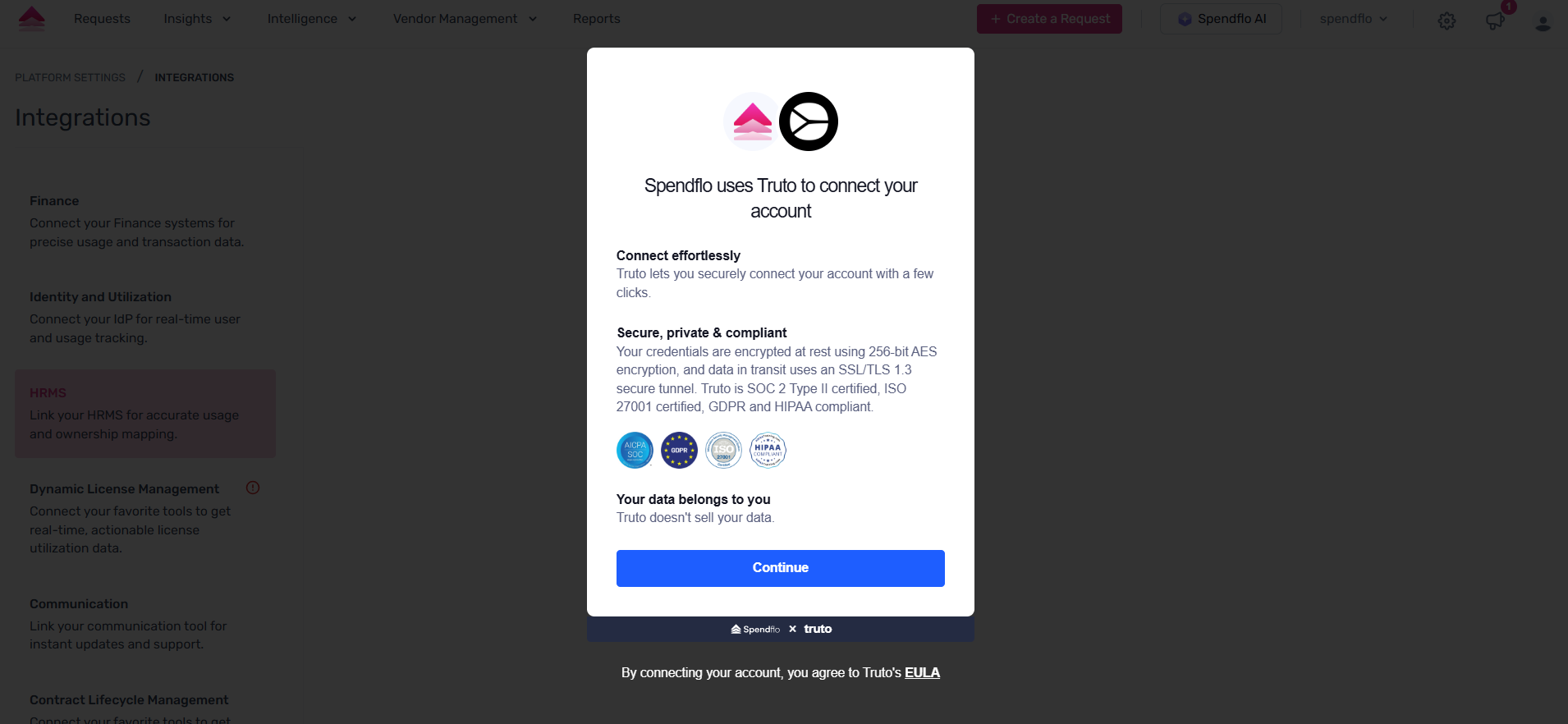 Step 3. Spendflo now uses Truto to connect your Hibob account securely. Click on Continue.