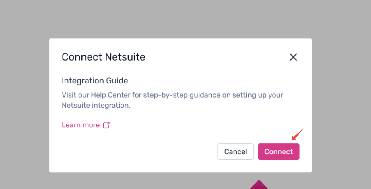 Step 2. Open the dropdown under Integrations → Finance and select the NetSuite integration. A modal containing the help documentation will appear—click Connect to initiate the integration.