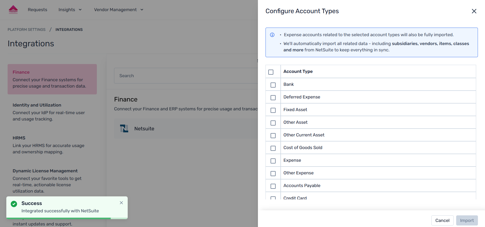Once NetSuite is successfully integrated, a slider panel will appear prompting you to select the Account Types you want imported into Spendflo.