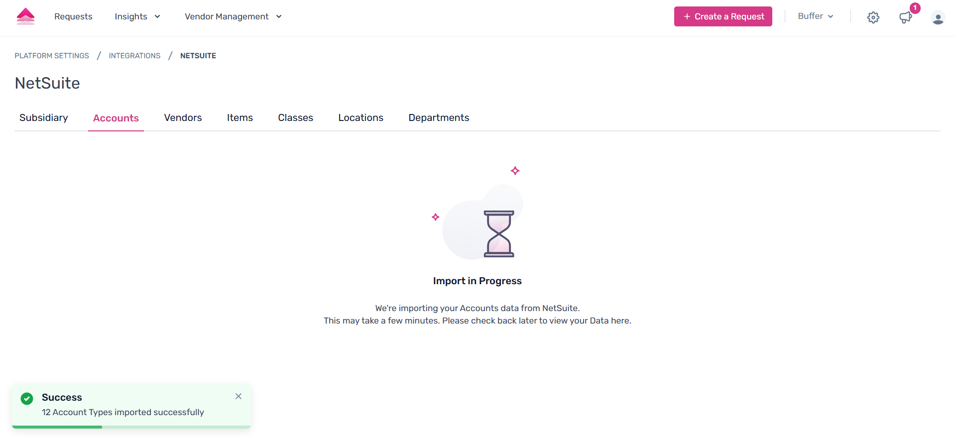 After the import completes, users can view all accounts, vendors, departments, subsidiaries, items, and other ERP data inside their respective Integration tabs in Spendflo.