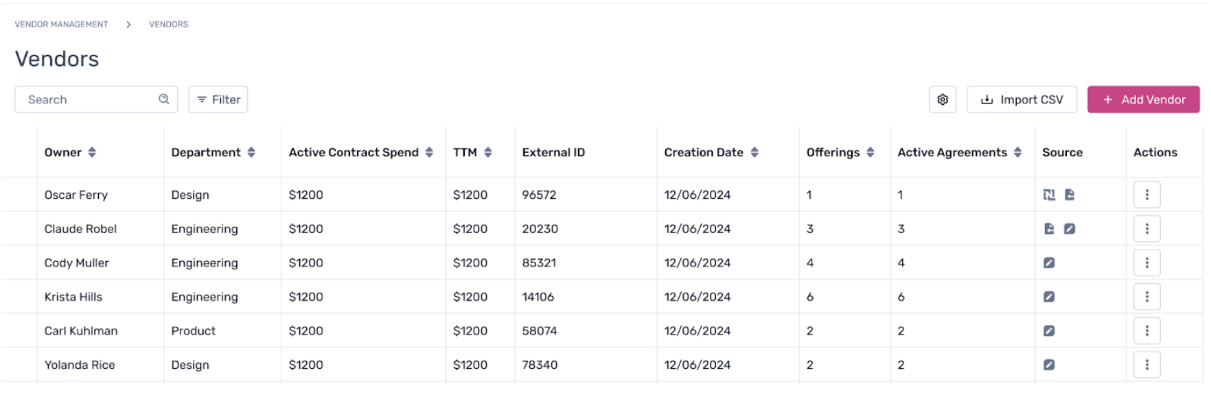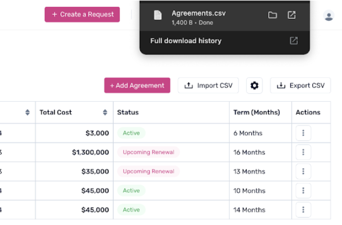 From the vendor listing page, click on “Export CSV” from the right side of the vendor table. This one-click action helps to export the current agreements listing as a CSV file.