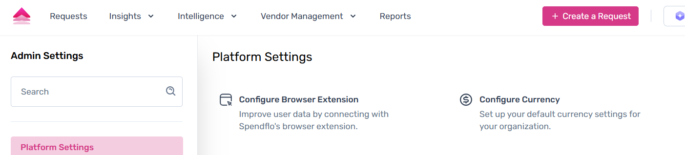 Under Platform Settings, users can access two configuration options — Configure Currency and Configure Browser Extension. The Configure Currency page allows organizations to define their base currency, ensuring consistency across all contracts, reports, and procurement data. The Configure Browser Extension page enables users to set up and manage the Spendflo browser extension, allowing seamless procurement and approval workflows directly within their existing tools.