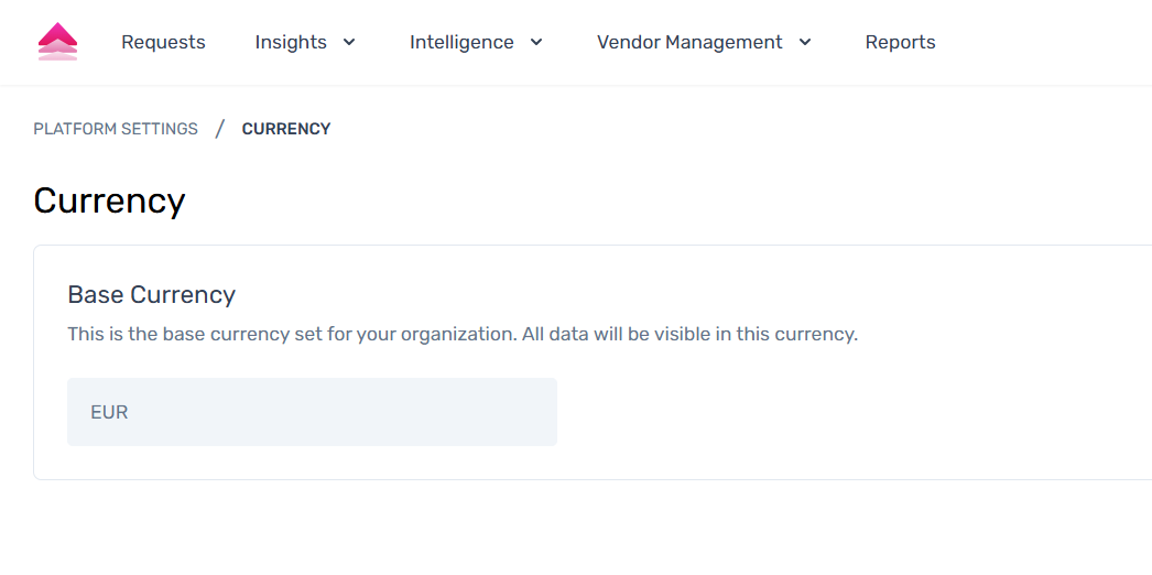 Note: The base currency is configured during onboarding and cannot be changed directly by the user in the initial release. For any updates, organizations need to contact Spendflo Support.