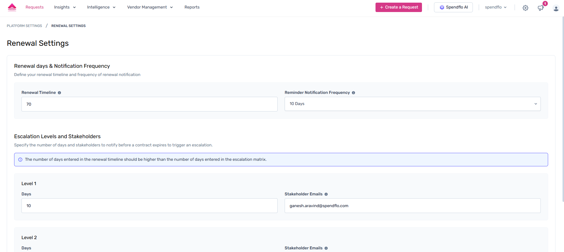 The Renewal Notification and Escalation Settings in Spendflo give you full control over how often and to whom renewal reminders and escalation emails are sent. With this feature, you can ensure timely renewals, reduce missed deadlines, and customize notifications to fit your procurement workflow.