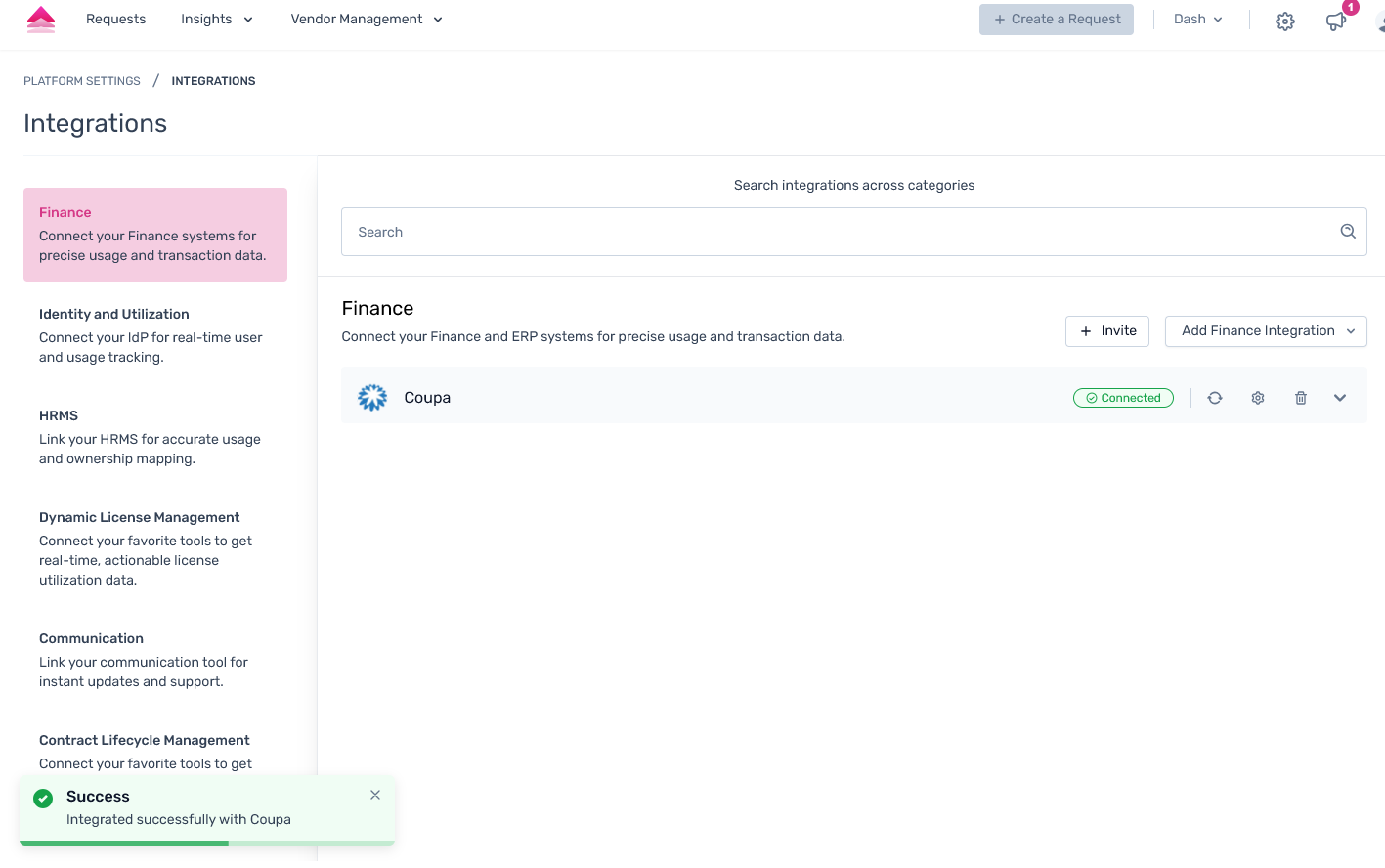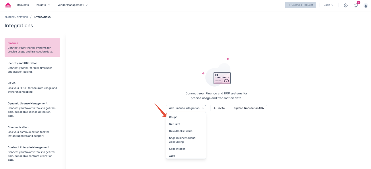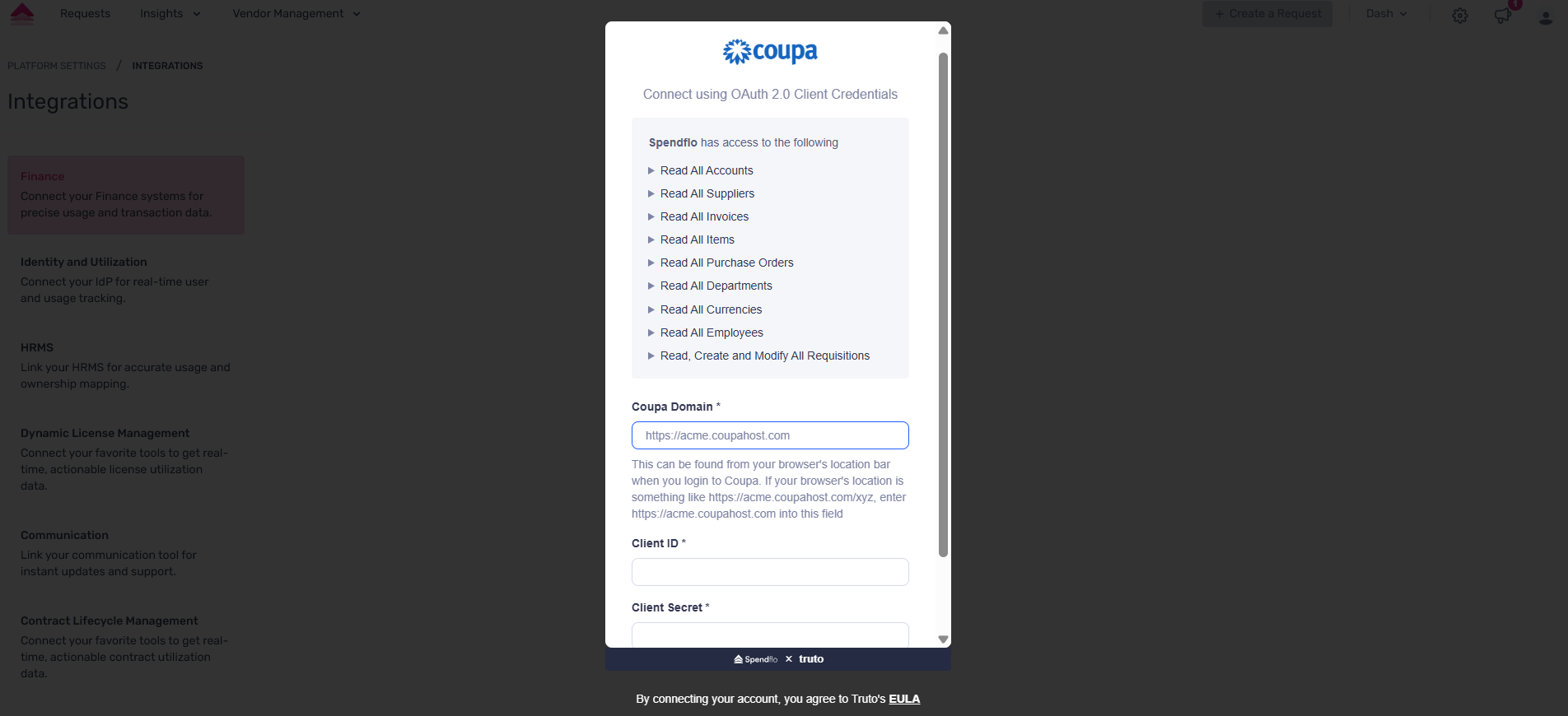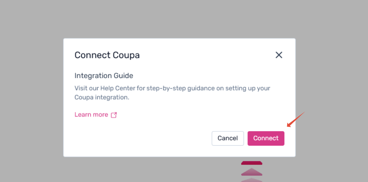Step 2. Open the dropdown under Integrations → Finance and select the Coupa integration. A modal containing the help documentation will appear—click Connect to initiate the integration.