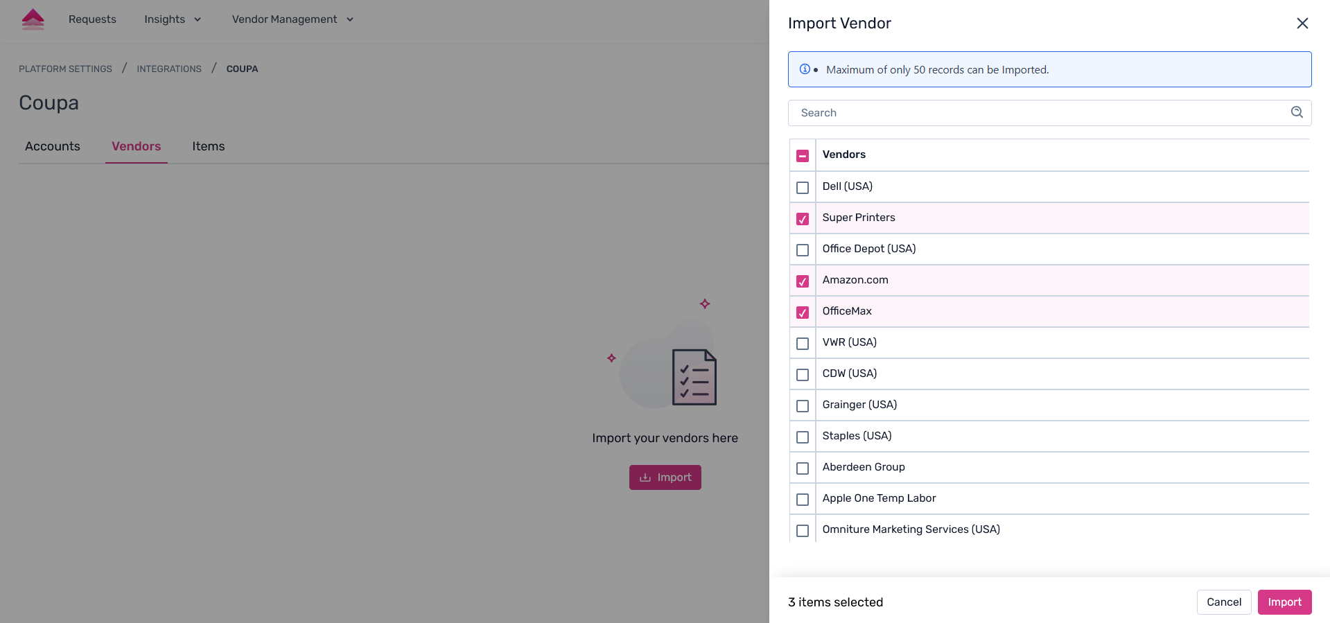 Step 2. A pop-up pane will appear as the right pane, where users can click on the required vendors to import.