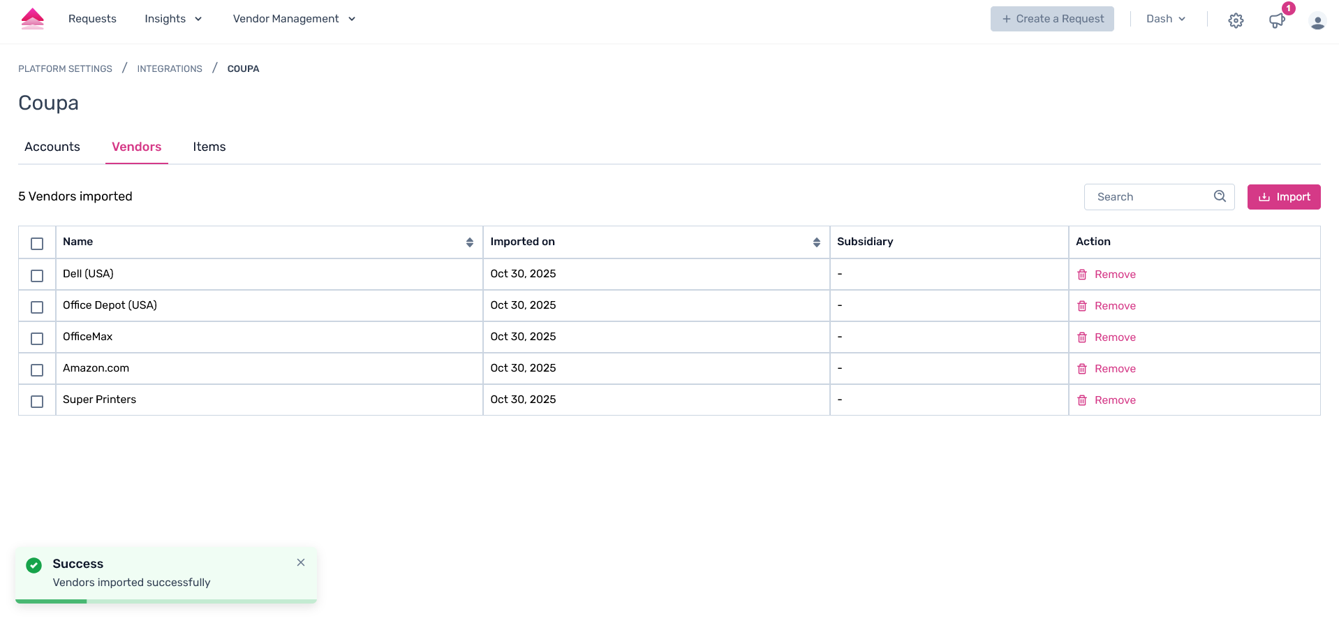 The vendors will seamlessly be imported successfully into the Spendflo platform from your Coupa account.