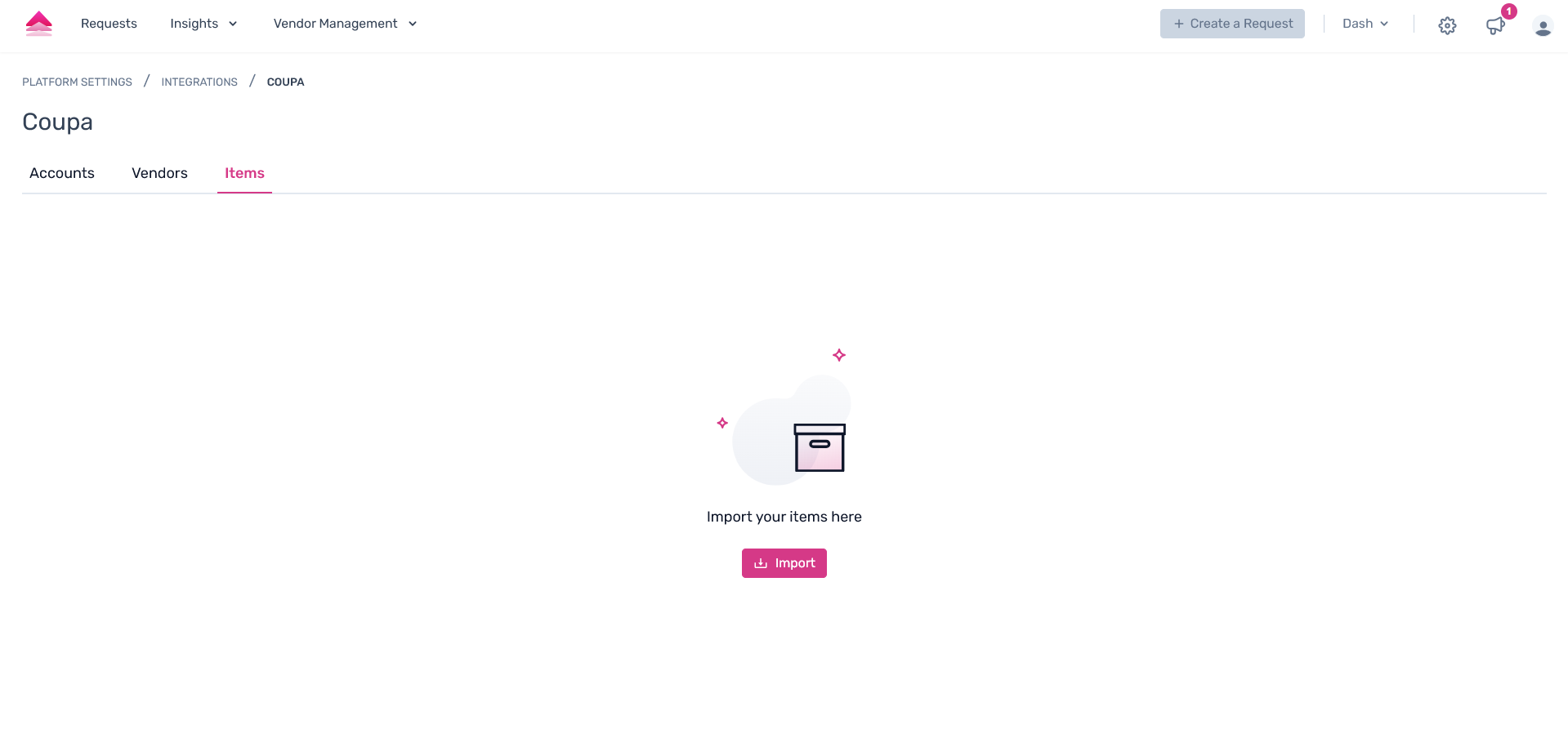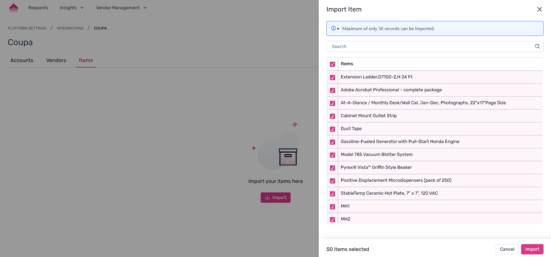 Step 1. From the Coupa integrations page, click on the “Items” tab. On this page, users can get the vendor data from your Coupa application.