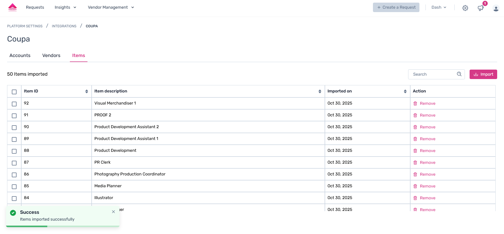 The items will seamlessly be imported successfully into the Spendflo platform from your Coupa account.